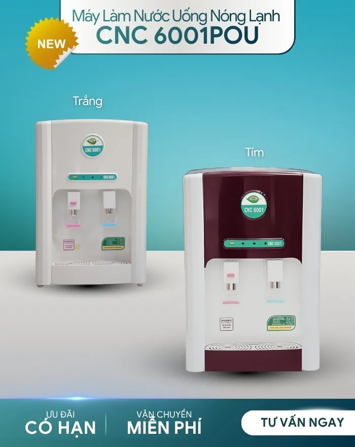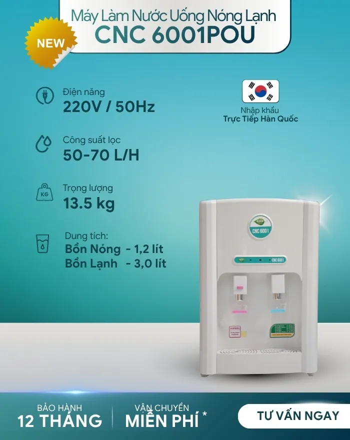 Máy lọc nước nóng lạnh CNC6001POU hỗ trợ công nghệ lọc hiện đại giúp phục vụ mọi nhu cầu của quý khách hàng. Đảm bảo nước uống đạt chỉ tiêu vi sinh theo tiêu chuẩn nước uống đóng chai QCVN6-1/2010 Bộ y tế.